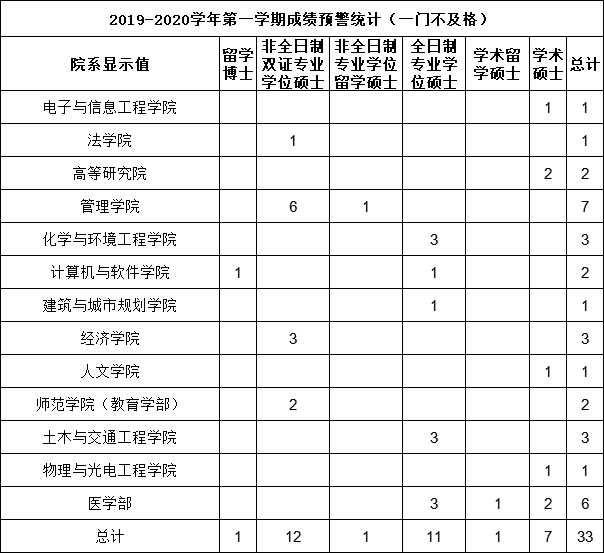 根据上述规定,我院对研究生学习年限、学习成绩等情况进行了核查,发现615名研究生已超出标准学习年限但未超过最长学习年限、519名研究生学位课(必修课)成绩未达75分或平均成绩未达75分、33名研究生一门必修课成绩不及格、1名研究生六门必修课成绩不及格(见附表)。现按规定对该批研究生分别进行学业温馨提示(邮件方式)、预警和退学,请相关学院(部)派人于2019年9月10日17:00前到办公楼428室领取上述学生的《学业预警通知书》或《学业退学通知书》(均一式三份),并尽快发放至导师、学生手中(请导师、学生本人签收),以督促学生顺利完成学业或办理退学手续。