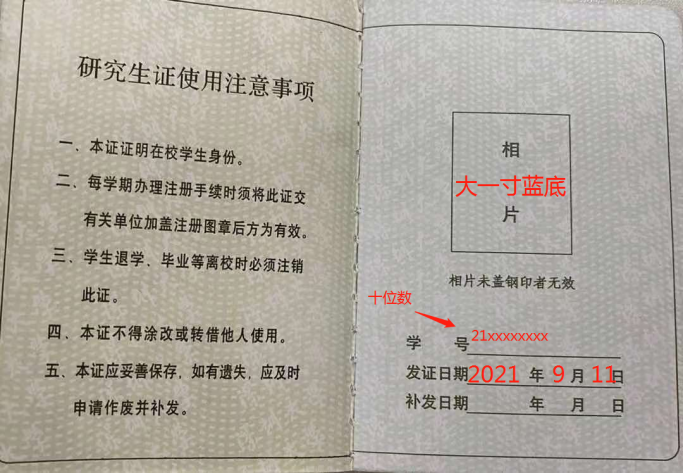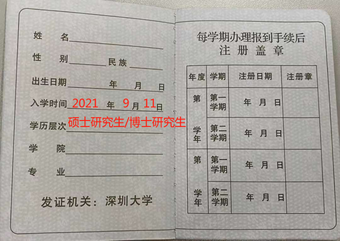 各学院(部): 2021级研究生新生已完成入学资格复查,所有复查合格的研究生,由学校在学信网注册学籍,并按照以下流程发放学生证。现将相关事项通知如下: (一)完善学籍信息 请各学院告知新生入学资格复查合格的2021级研究生于9月30日后登陆“深圳大学网上办事大厅”,打开“我的学籍”页面完善个人信息,显示内容请务必填写完整、准确。 籍贯、生源地、火车终点站、研究方向、专业方向等信息的修改须提交相关证明材料给学院负责老师,并由负责老师登录“网上办事大厅”(http://ehall.szu.edu.cn)—>“学籍信息管理”—>“信息变更审核”(菜单右上角)进行审核。 (二)打印学籍卡 研究生打开“信息浏览”页面打印学籍卡2份并在空白处签名,连同大一寸蓝底彩色照片1张(背后用铅笔注明学号姓名),于10月11日17:00前上交学院。 (三)审核学籍卡 为保证学生证信息准确,请各学院老师务必组织审核新生学籍卡上的信息。此外,必要信息如紧急联络人等信息务必填写完整、正确。 (四)领取空白学生证 研究生院将根据学院(部)上交的《2021年录取研究生学籍信息核对表》和《学籍卡》(学院均留存一份)内容发放对应数量的空白学生证。 (五)上交填写好的学生证 各学院老师根据学院存档的学籍卡信息,组织专人按照《研究生学生证填写规范示意图》(下图)统一填写学生证上相关信息,并贴好大一寸蓝底彩色照片,于10月21日17:00前交到汇元楼419办公室。