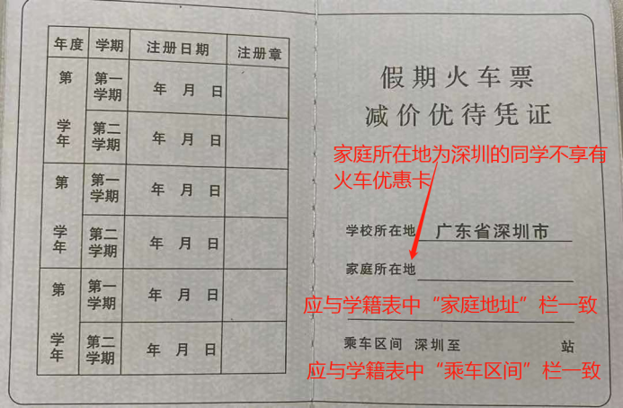 (六)发放盖好章的学生证 研究生院培养办公室收齐审核后,前往校办盖章。制作完成后,由学院在学生证上“第一学期注册栏”填写注册日期并盖注册章后发至学生手中。 (七)学生自助录入火车优惠区间 拿到学生证,需要使用火车优惠的同学,请关注微信公众号惠通学子,在“惠通学子”小程序中进行注册、填写信息,通过火车票学生优惠卡自助服务终端机器自助录入行车优惠区间。(使用说明请见附件一) 火车票学生优惠卡自助服务终端机器摆放地址: 1. 粤海校区学生活动中心 2. 丽湖校区综合服务大厅 (八)注意事项 1、各学院请及时通知,按时提交相关材料。 2、学生证信息须与学籍卡信息保持一致,填写时务必确保信息准确。 3、学生证火车乘车区间须与家庭住址保持一致,家庭住址在深圳本地的不享有火车优惠。 4、如发现弄虚作假行为,将按照学校有关规定处理。 联系人:张之蔚 联系电话:26732906 |
