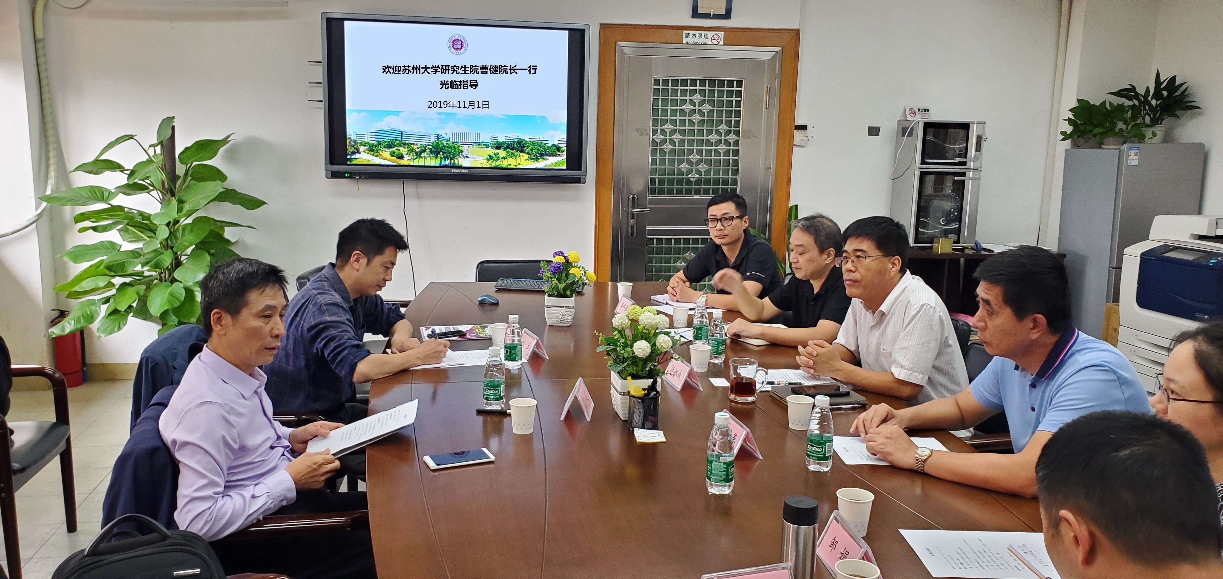 11月1日下午,苏州大学研究生院曹健院长、培养办刘洋科长一行来我校调研交流。我校研究生院执行院长汪永成、副院长李国、党委研工部副部长徐诚革及相关办公室负责人与来客进行了座谈交流。