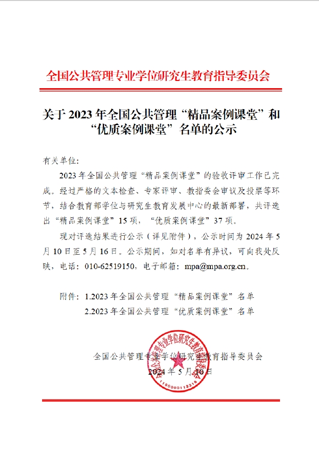 全国公共管理“精品案例课堂”和“优质案例课堂”项目是全国公共管理专业学位研究生教育指导委员会受教育部学位与研究生教育发展中心委托,为加大案例教学力度,带动案例教学方法创新和理念传播,探索公共管理专业学位案例教学范式,推动案例更好服务实践创新人才培养而设立和开展的建设项目。项目建设以服务高质量公共管理专业学位案例教学育人成效为着力点,聚焦服务人才培养,案例教学模式创新,示范教学和经验传播。