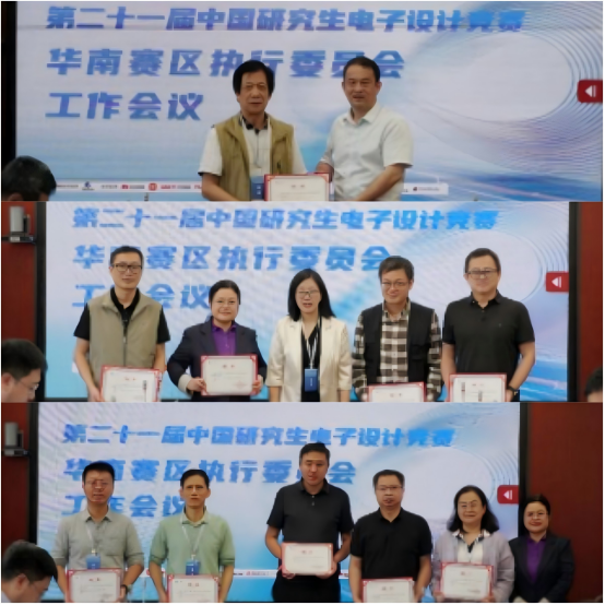 会议期间进行了执委会顾问、副主任委员和委员的聘书颁发仪式。周校长为华南赛区总顾问华南理工大学电子与信息学院殷瑞祥教授颁发聘任证书。杨一平为执委会副主任委员颁发聘书。周浩江书记为执委会委员颁发聘书。执委会队伍的持续壮大,为推动研电赛高质量发展注入强劲动能。