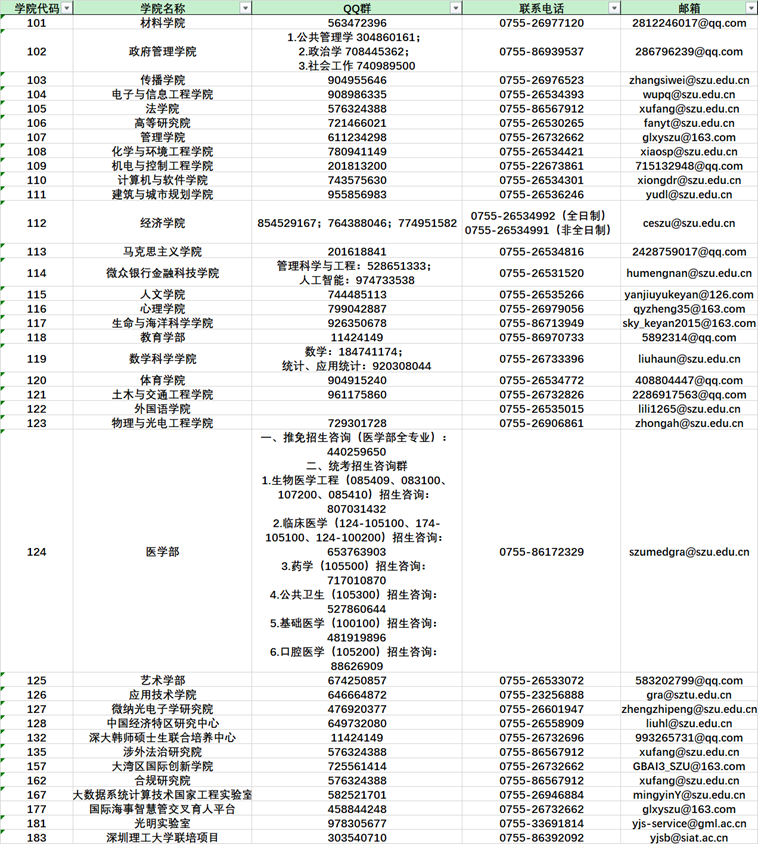 3、为便于各位获得推免资格并且有意推免到深圳大学的优秀学子找到组织,了解学院更多第一手招生资讯,现特此公布深圳大学各招生学院2025年推免生招生联系方式及QQ群、企业微信群。