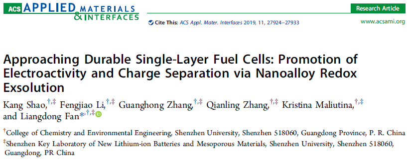 范梁栋课题组还将上述出溶或外延生长构建的金属/氧化物-钙钛矿氧化物复合材料用于新型陶瓷燃料电池(又称单层燃料电池或半导体-离子燃料电池)。题为《Approaching Durable Single-Layer Fuel Cells: Promotion of Electroactivity and Charge Separation via Nanoalloy Redox Exsolution》研究性论文由硕士研究生邵康同学为第一作者、深圳大学范梁栋为通讯作者合著,深圳大学为第一作者单位和唯一通讯单位。该论文发表于国际期刊ACS Applied Materials & Interfaces(影响因子9.229,中科院大类1区)上。该工作发表至今已被引61次。