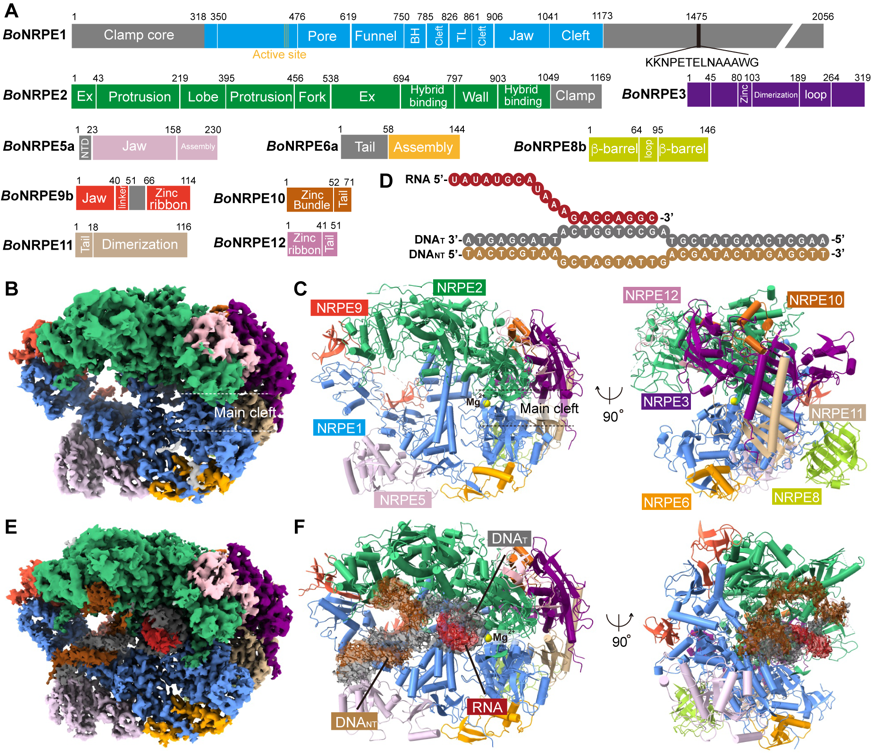 RNA聚合酶是由多亚基组成的复合物,负责转录生成不同类型的RNA,该家族共有5个成员,其中的Pols I-III在所有真核生物中均保守,而Pol IV和Pol V则是植物中特有的。其中Pol V作为核心组分参与了植物特异的由非编码RNA介导的DNA从头甲基化过程,在该调控途径的下游,Pol V通过产生lncRNA(long non-coding RNA)来招募DNA甲基转移酶从而引起基因组特定位点的基因沉默。在过去的几十年,RNA聚合酶家族的不同成员的结构陆续被解析,相应的生化活性与体内功能均已有深入研究,而Pol V作为家族的最后一员,其分子结构以及在DNA从头甲基化通路中作为支架而滞留在染色质的分子机制仍然是领域内亟待解决的重要科学问题。