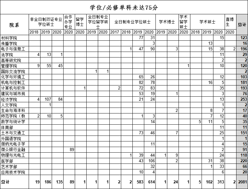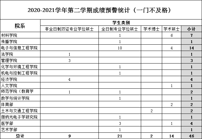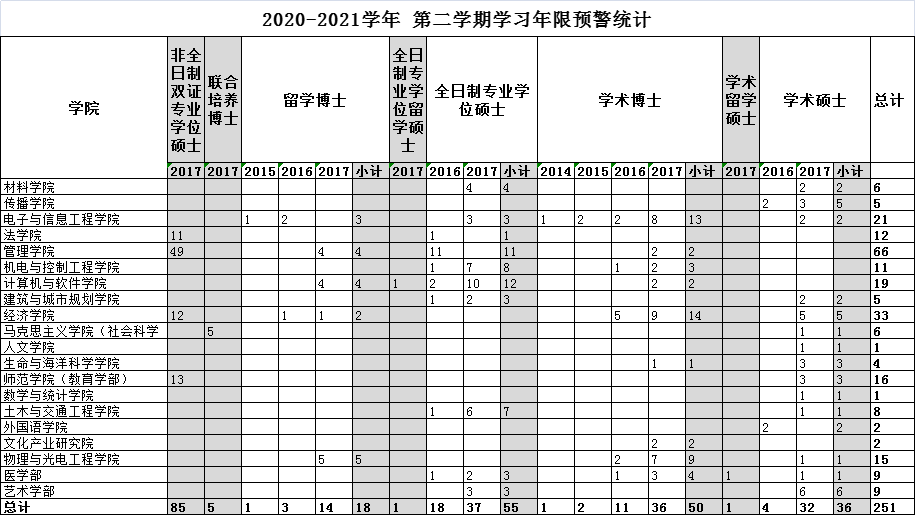 我院近期对研究生学习年限、学习成绩等情况进行了核查,发现251名学生已超出标准学习年限但未超过最长学习年限、46名学生有一门必修课成绩不合格、80名学生学位课/必修课平均分未达 75 分、2081名学生有一门或多门学位课/必修课成绩未达75分(见附表),按规定对超出学习年限及有必修课不及格的研究生进行学业预警,对学位课/必修课成绩平均分或有一门/多门未达75分的研究生发送邮件温馨提示。《学业预警通知书》(一式三份)已于3月20日前发至学院,请学院及导师予以重视、督促相关学生努力学习,顺利完成学业。